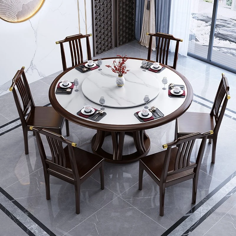 雅麦嘉の新中式実木ダイニングテーブル&チェアセット - 高級感あふれる大理石風ラウンドテーブル、回転盤付きで食事がもっと楽しくなる!ご家庭にぴったりの円形テーブルです。