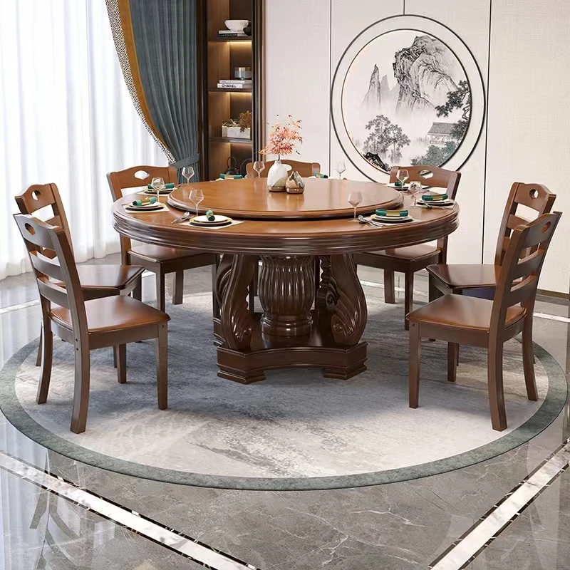 雅麦嘉新中式の実木製ラウンドダイニングテーブルセット - 回転式、10人用、家族やレストランに最適な大容量!快適でスタイリッシュな食卓を演出します。