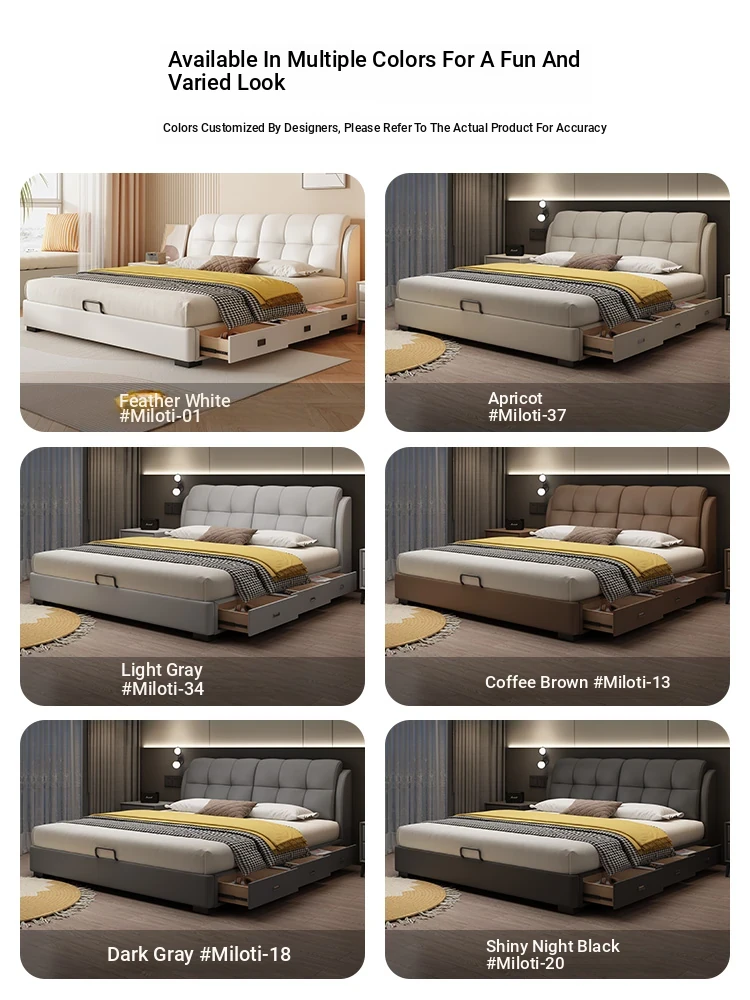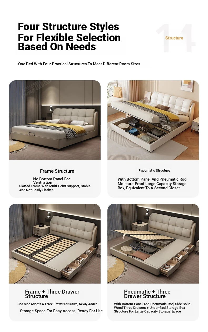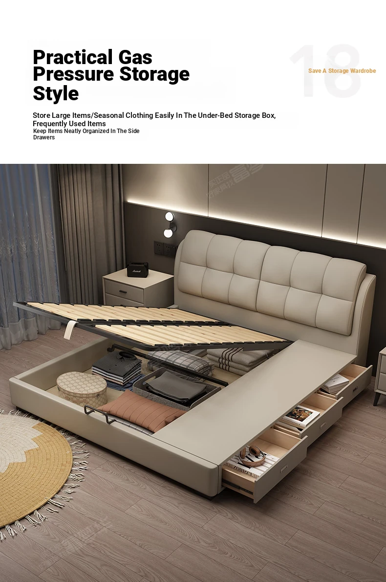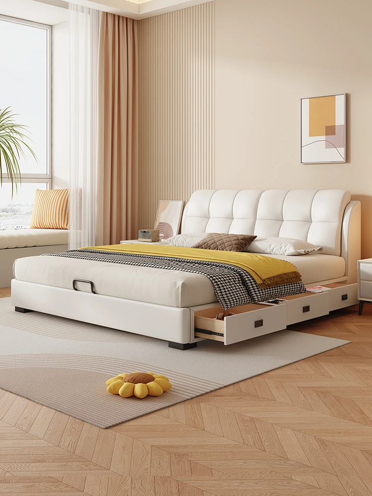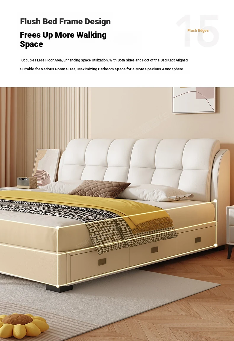 French Creamy Dream Luxury Leather Bed - Modern Minimalist Cloud Puff Wedding Bed for Girls’ Master Bedroom with Storage - Perfect for Style and Comfort!