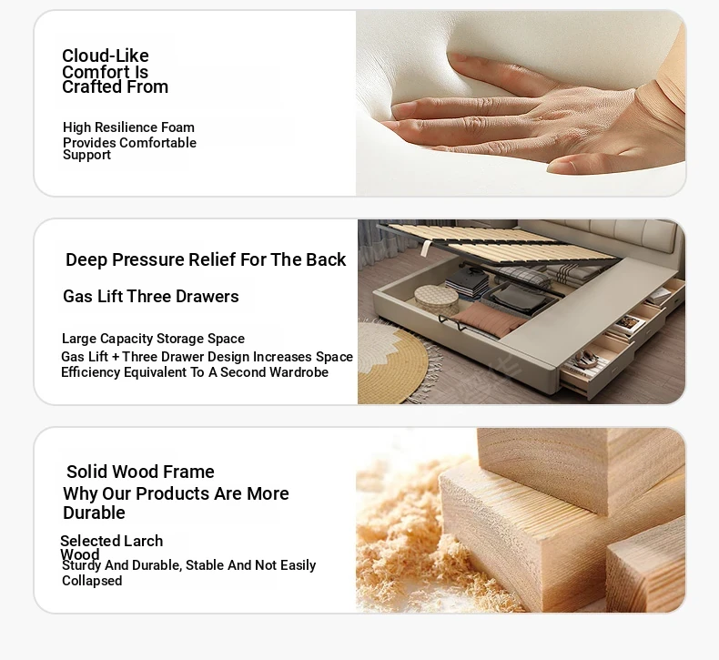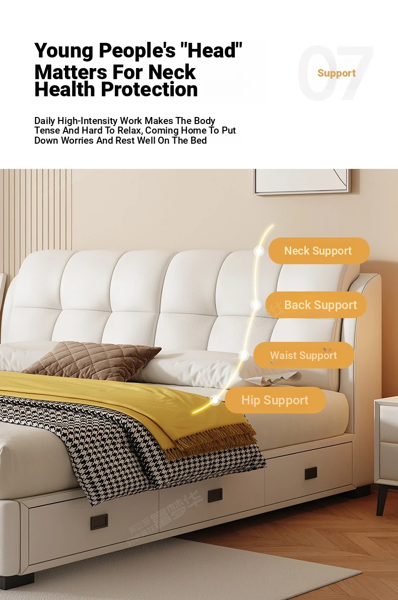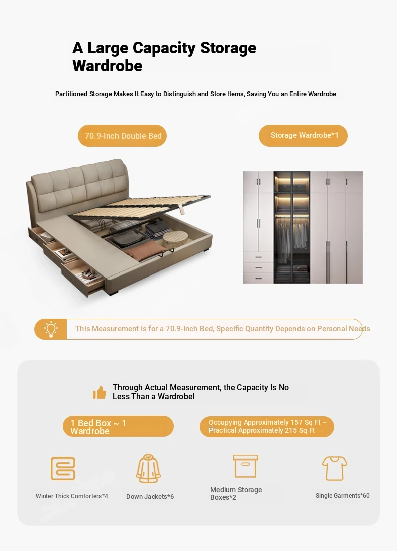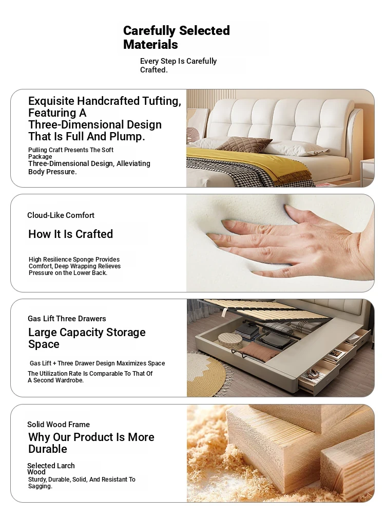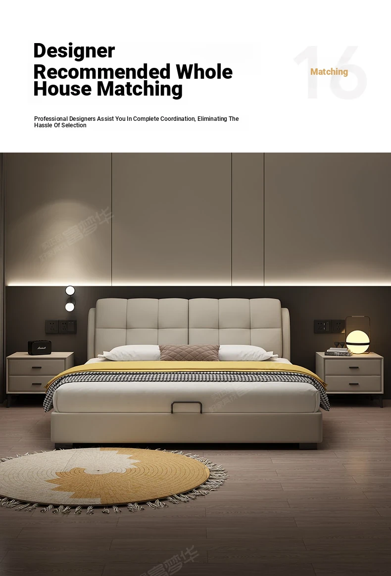 French Creamy Dream Luxury Leather Bed - Modern Minimalist Cloud Puff Wedding Bed for Girls’ Master Bedroom with Storage - Perfect for Style and Comfort!