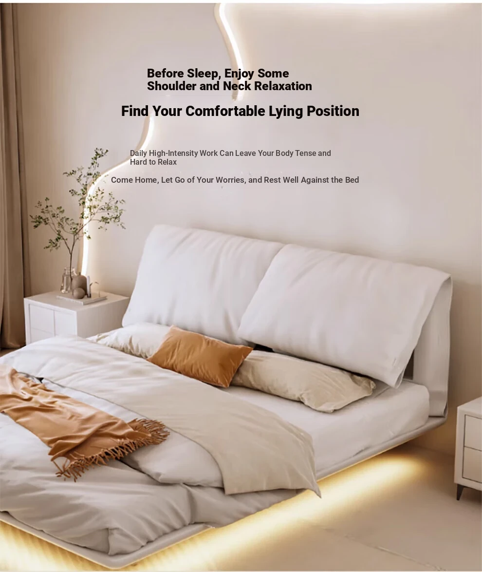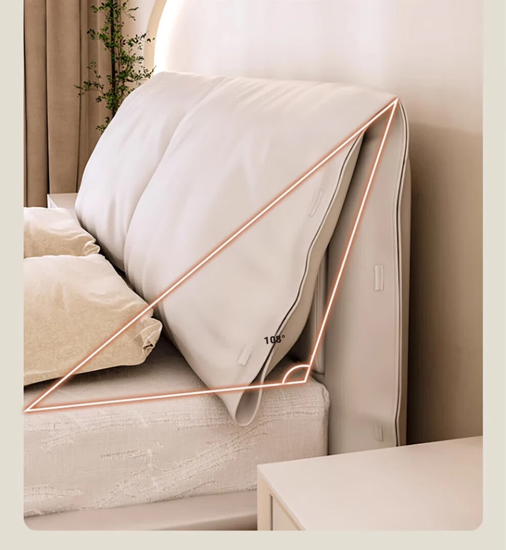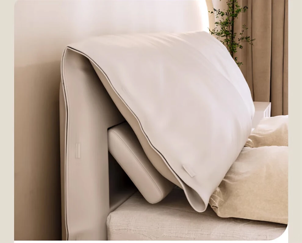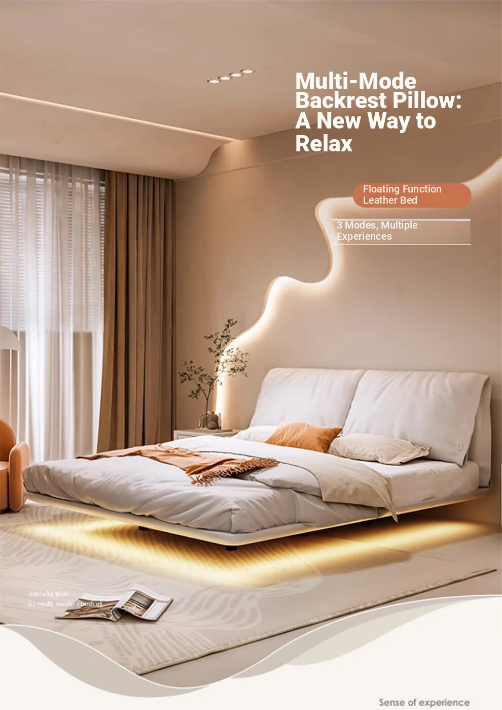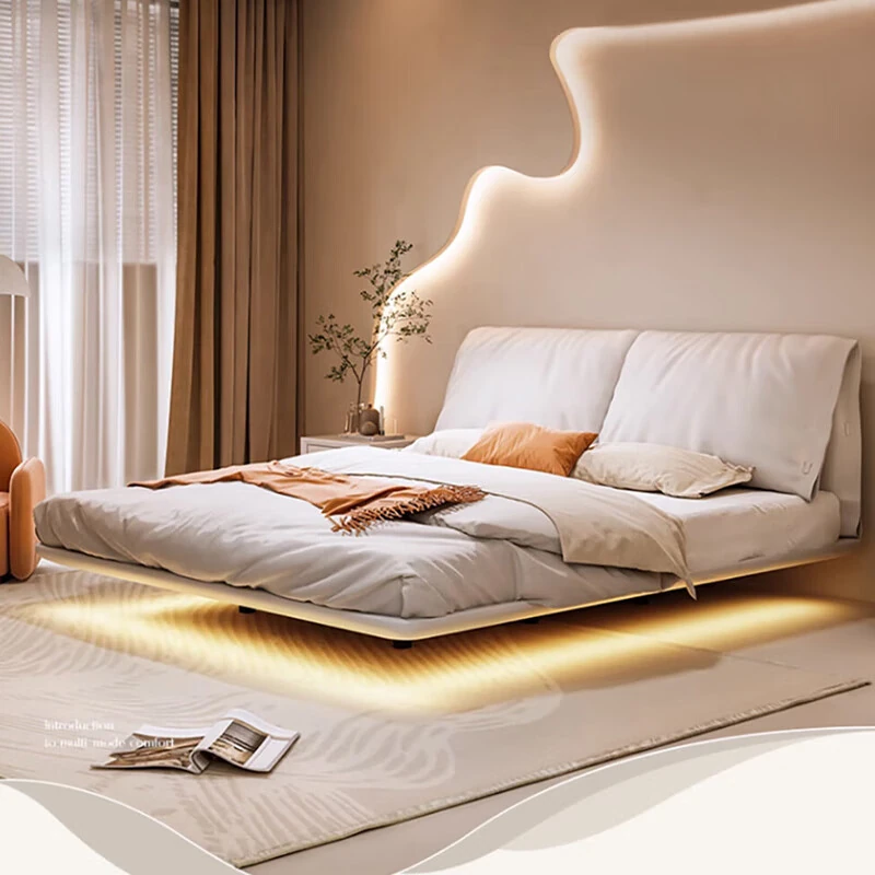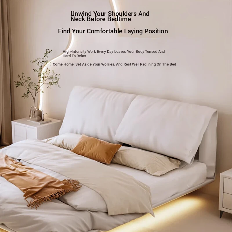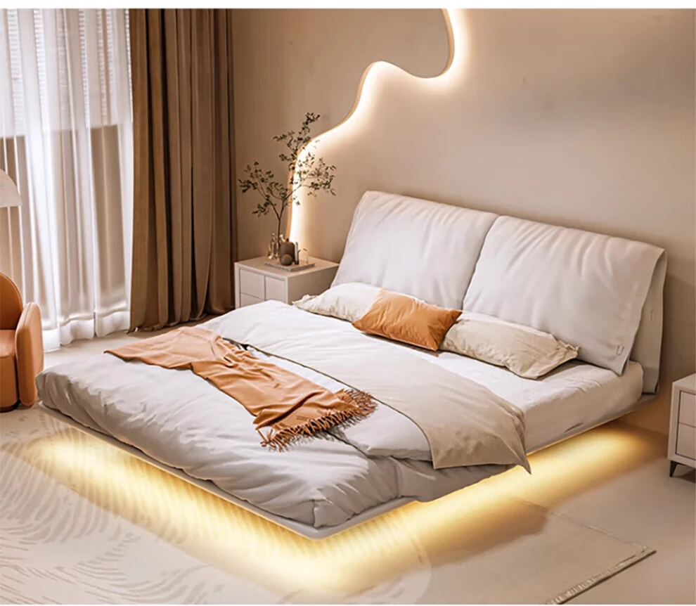 Kaimiao Creamy Floating Bed - French Style Genuine Leather Soft-Backed Double Bed for Master Bedroom, Modern Minimalist Luxury with Elephant Ear Design - Perfect for Stylish Living Spaces.