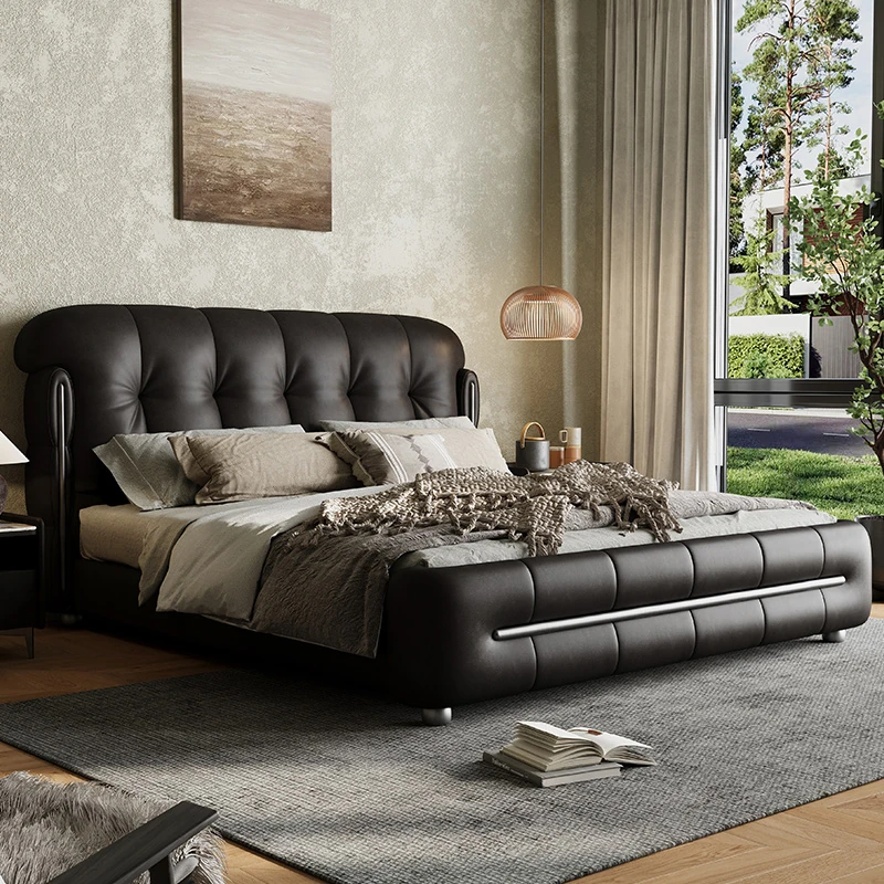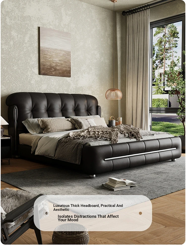 Talmann Premium Luxury French Retro Modern Minimalist Chic Velvet Upholstered King Size Black Leather Bed for Master Bedroom - Elegance Meets Comfort in Solid Wood Design