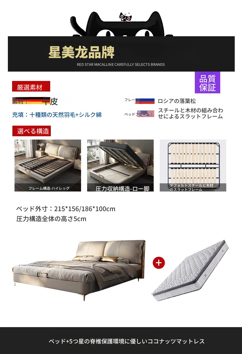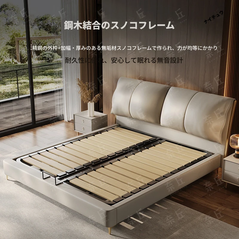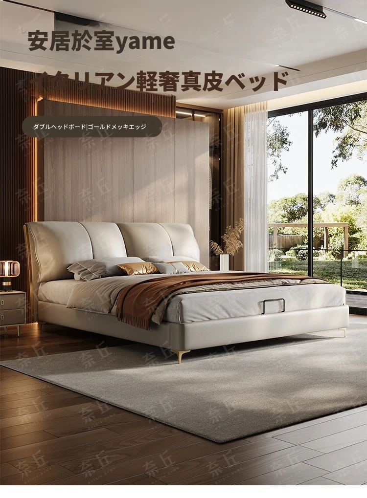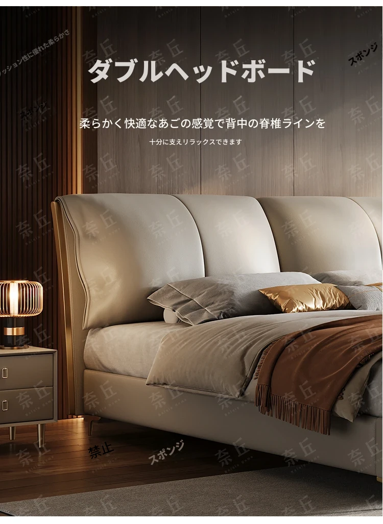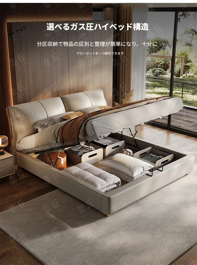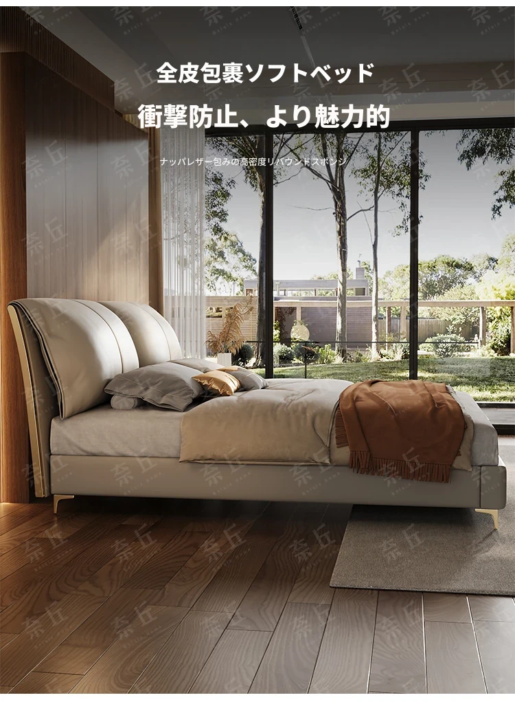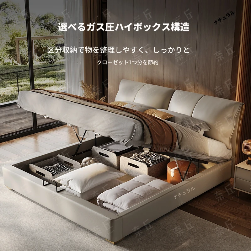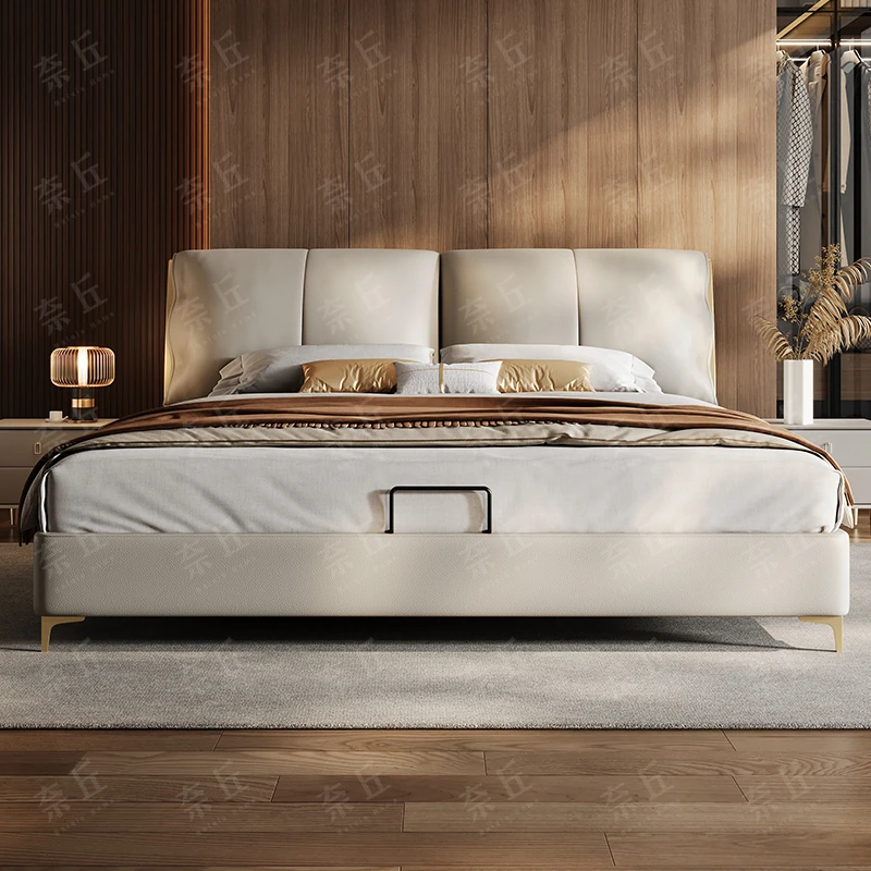 ナイキュー新作ダウンソフトパッケージ本革ベッド - 主寝室にぴったりなミニマリズムデザイン!象耳スタイルのラグジュアリーで高箱収納ベッドで、贅沢なスペースを実現!