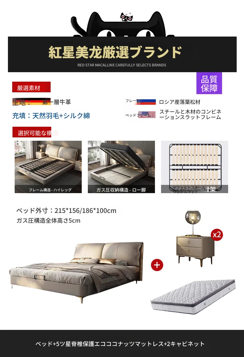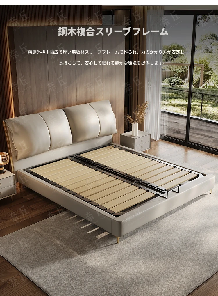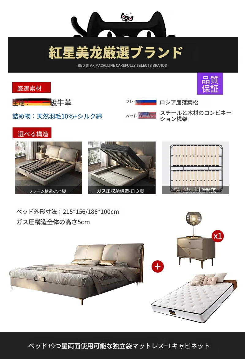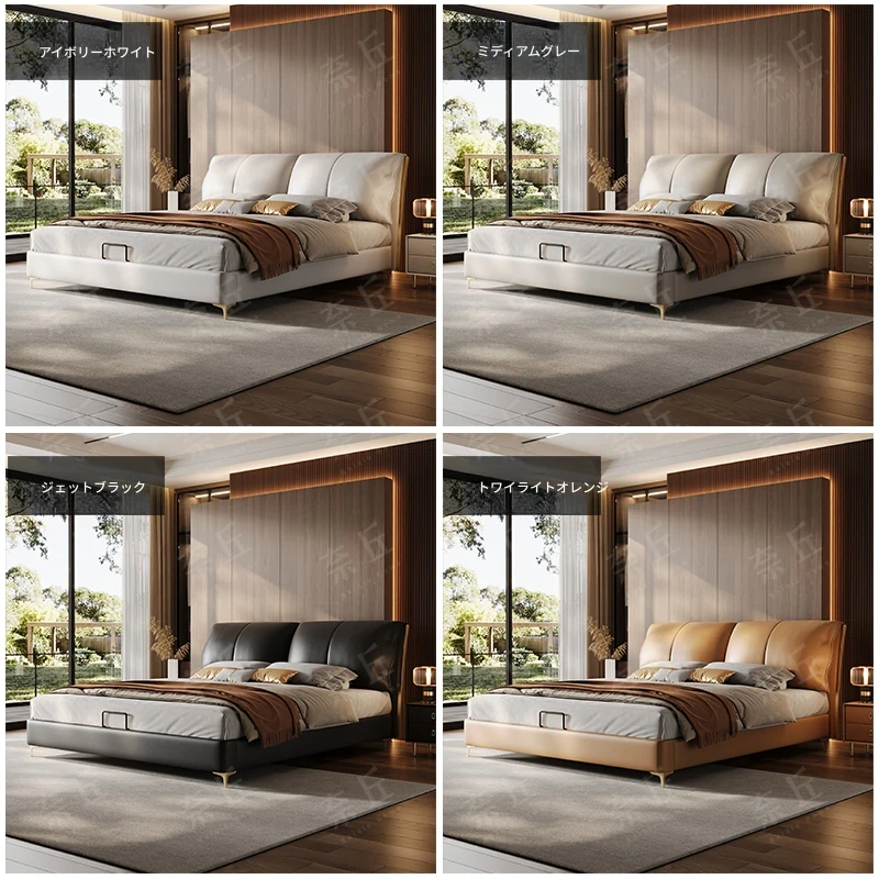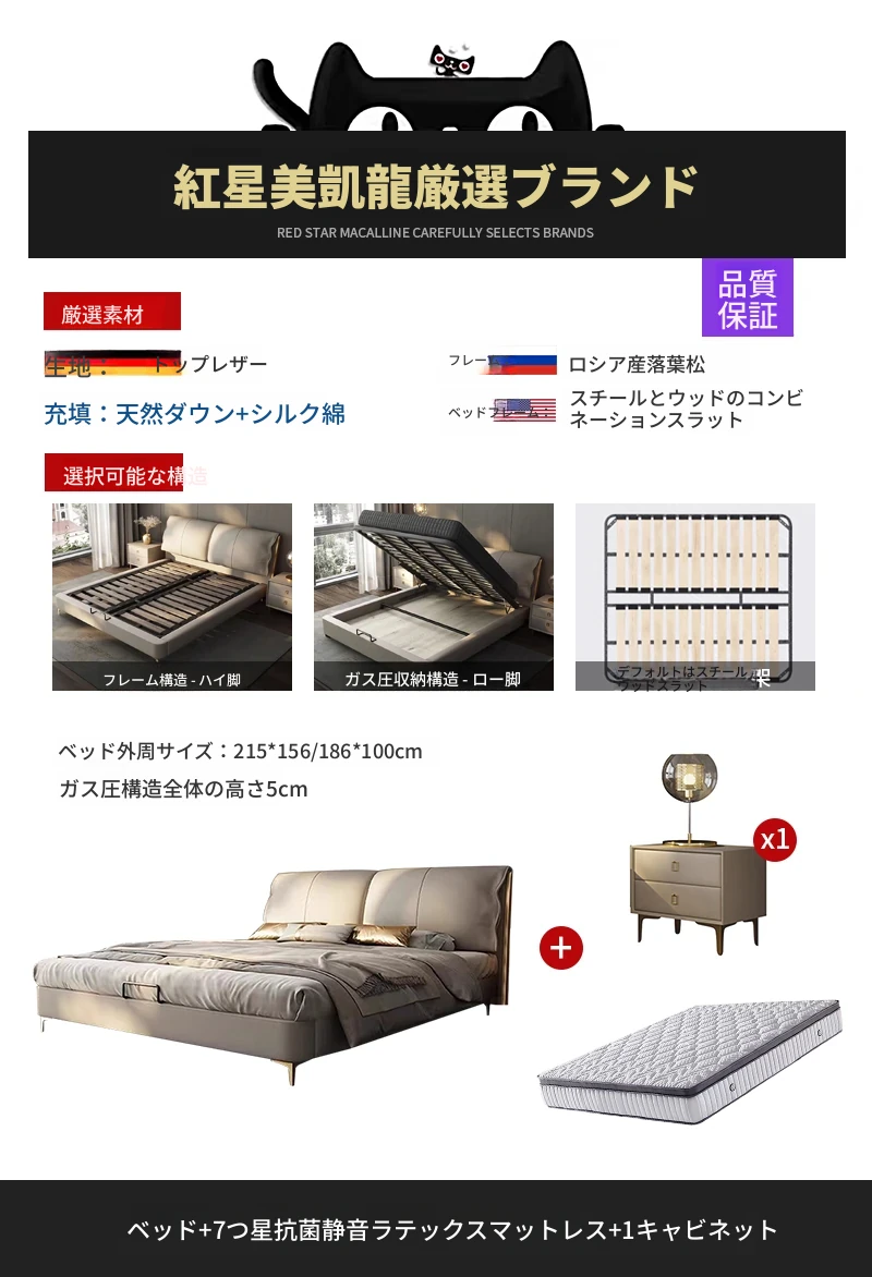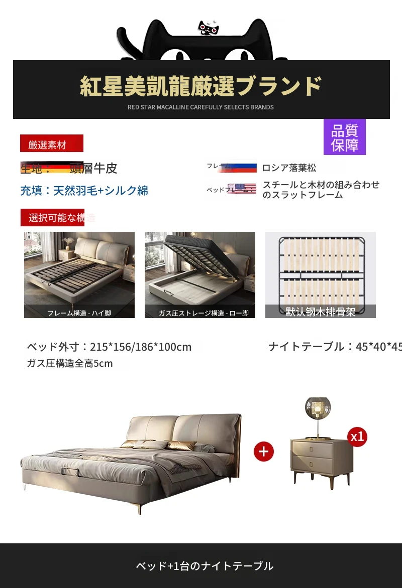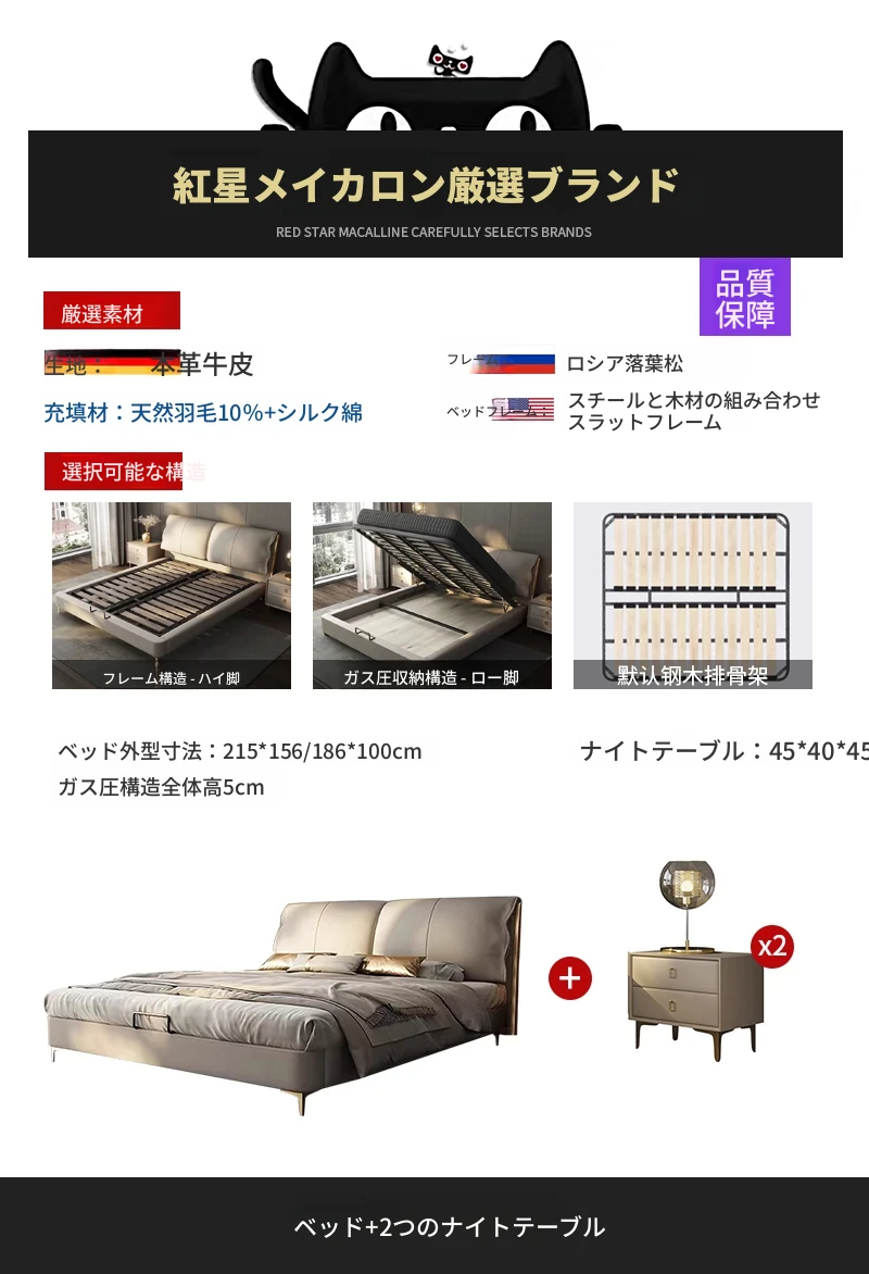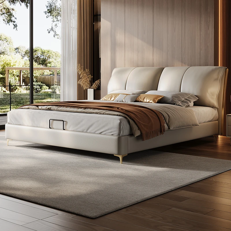 ナイキュー新作ダウンソフトパッケージ本革ベッド - 主寝室にぴったりなミニマリズムデザイン!象耳スタイルのラグジュアリーで高箱収納ベッドで、贅沢なスペースを実現!
