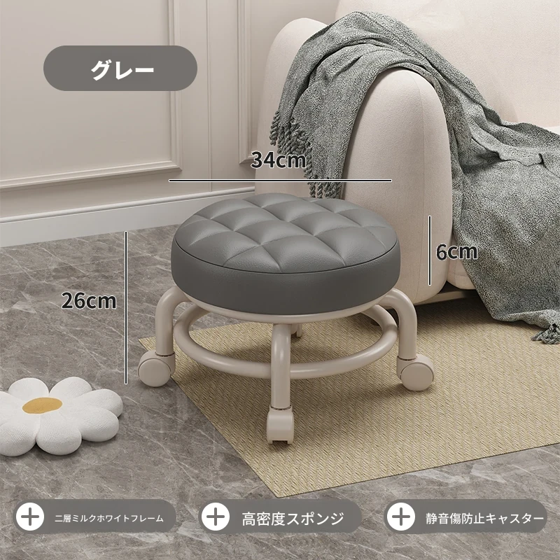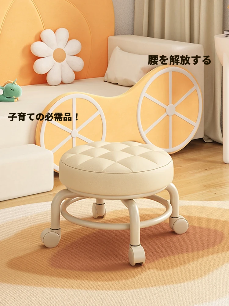 三夢スワivelローラー付きスツール - 家庭用・キャスター付き・丸型・子供用背もたれ付き・クッション交換用スツールで、快適な靴の履き替えをサポート!